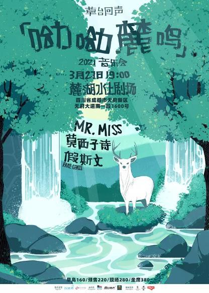 2021用音乐开启新的一年,当"解忧爵士"Mr. Miss,遇上音乐诗人莫西子诗加上假斯文FakeGentle的自由不羁有思考、有力量、有自由用声音武装到灵魂,3月27日在成都麓湖水上剧场,新一年的快乐从这里开始!