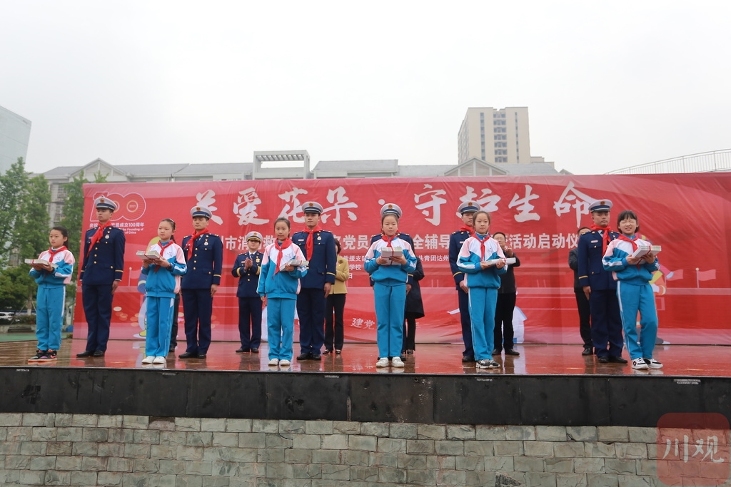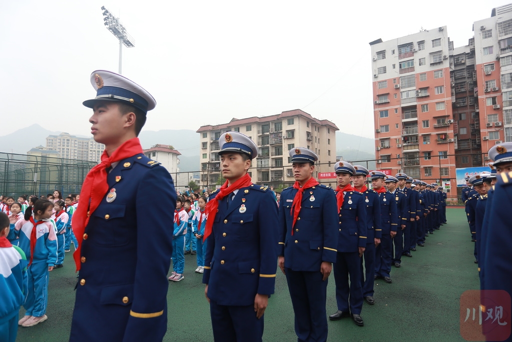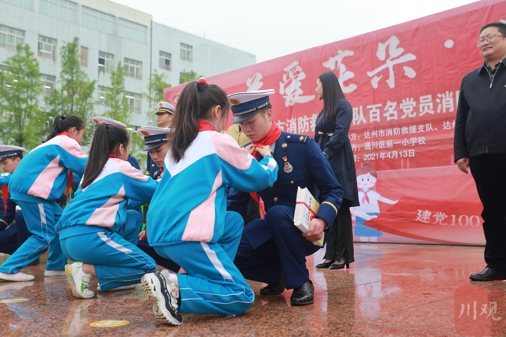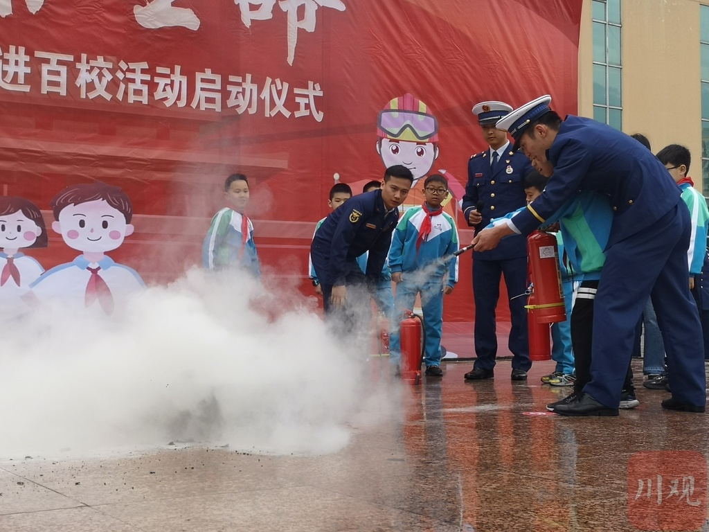启动仪式上,来自达州市消防支队的党员消防服员代表获得了通川一小颁发的“消防安全辅导员”聘书,通川一小学生为消防安全辅导员佩戴了红领巾,后者则赠送了消防安全知识书籍。受聘的消防安全辅导员、达州市消防救援支队防火监督科科长潘潇现场授课,教学生如何正确使用干粉灭火器,点起熊熊燃烧的大火,辅助孩子们用灭火器灭火。