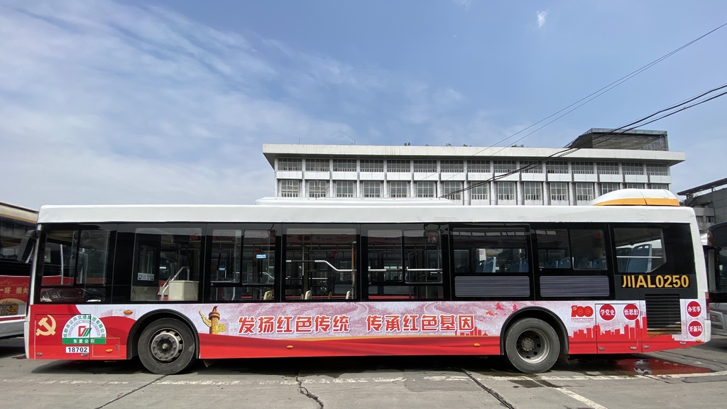 4月13日,一辆红色主题装饰的27路公交车缓缓驶入站点,车身上“发扬红色传统 传承红色基因”、“学党史 悟思想 办实事 开新局”等字样和中国共产党成立100周年庆祝活动标识格外醒目。