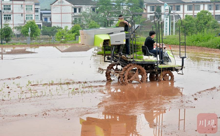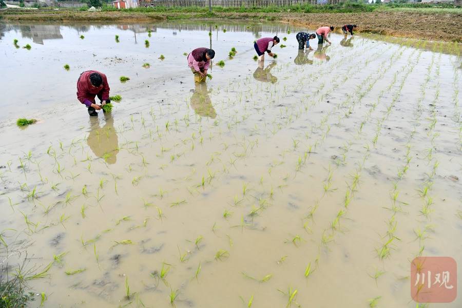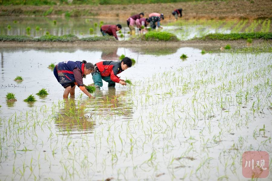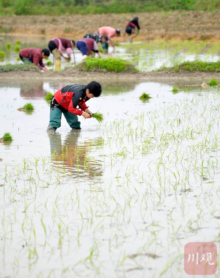 2021年4月13日,广安市邻水县社会化服务队的农业工人在九龙镇羊鹿村为村民栽插水稻,提供代种服务。