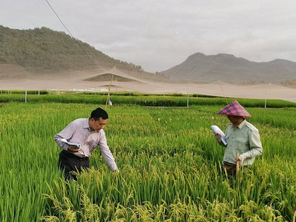 省农科院南繁基地内,省农科院副院长任光俊(左)在田间查看水稻长势。