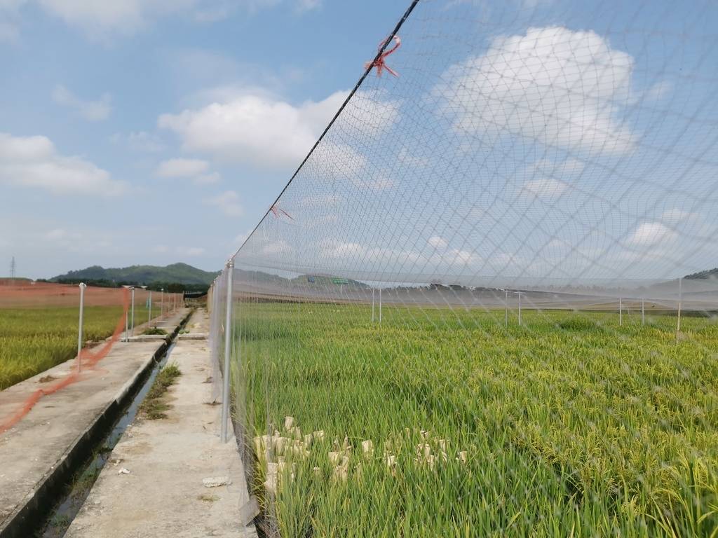 除了防家禽,还要防鸟。 一走进农田,就能看到农田上高高撑起的防鸟网。“这叫做天罗地网。”省农科院作物所副研究员刘文江笑着说道,“2、3月份水稻进入灌浆期,只有南繁基地内有水稻,鸟儿都集中在这一片。”