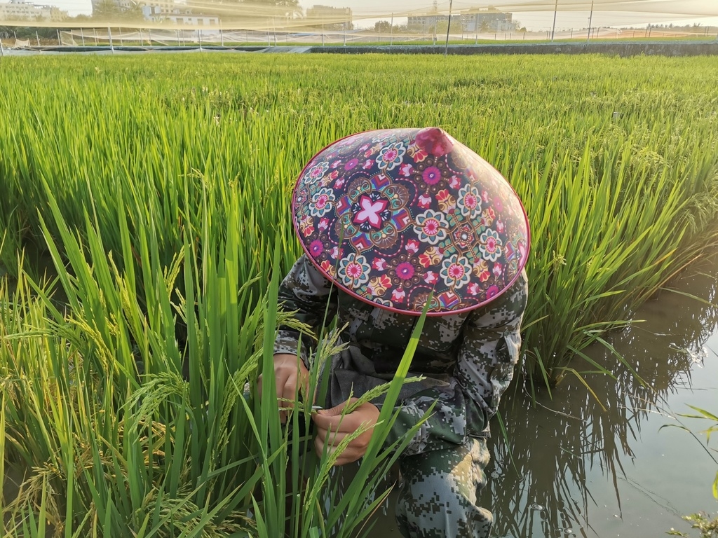 省农科院作物所水稻中心主任任鄄胜在南繁基地内育种。