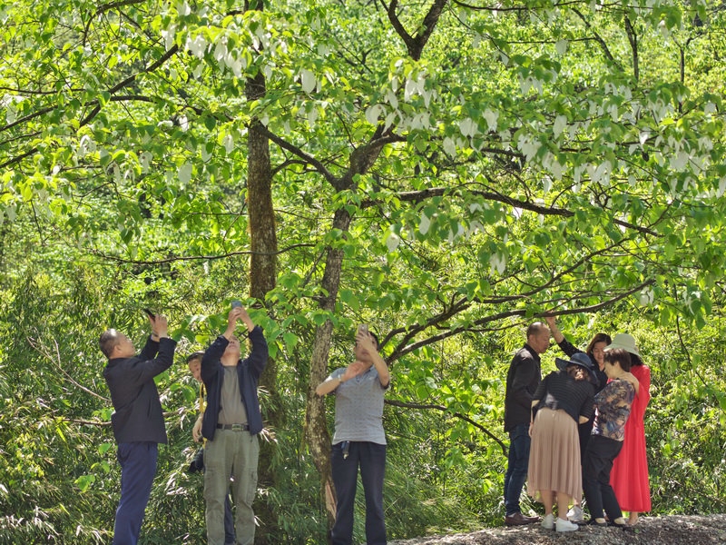 4月,游客在龙苍沟大石坝零距离邂逅鸽子花。