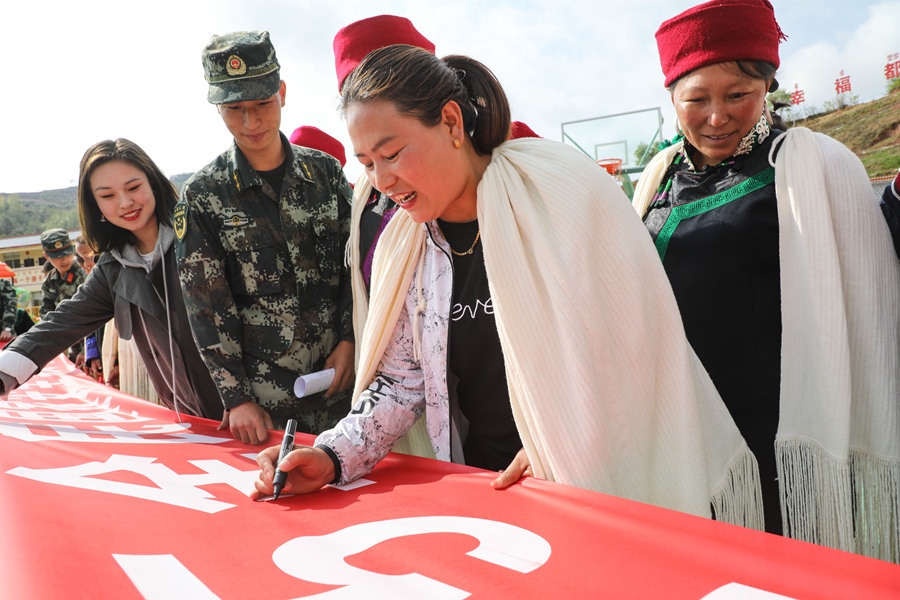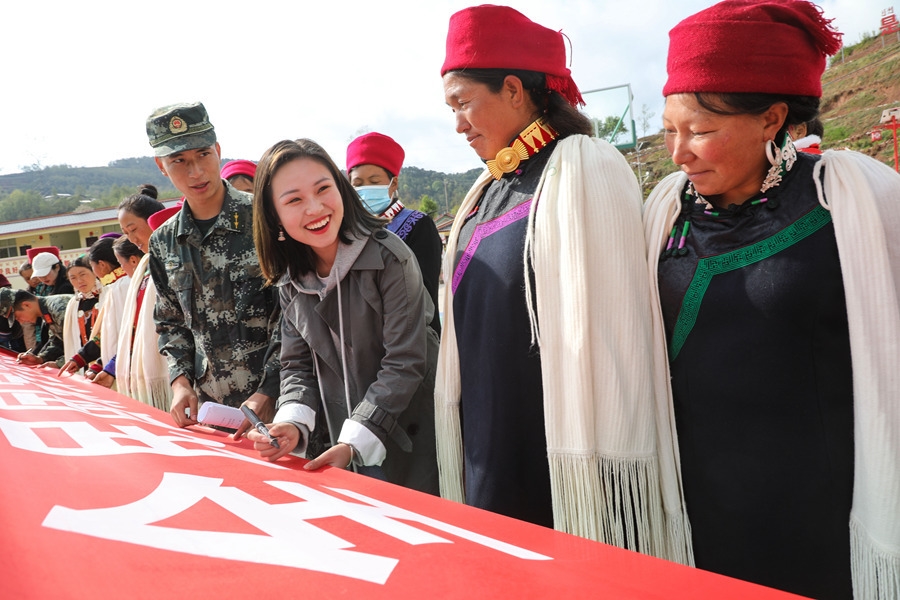 4月14日,在四川省凉山州昭觉县四开乡梭梭拉打村广场,武警官兵和彝族群众举行“全民国家安全教育日”签名活动。