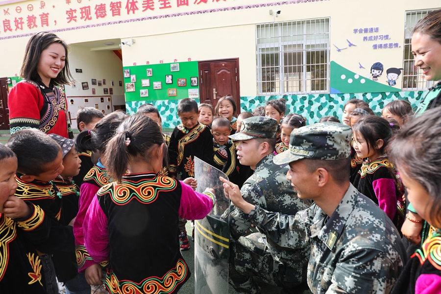 4月14日,在四川省凉山州昭觉县四开乡梭梭拉打村武警爱民幼儿园,武警官兵通过讲解国家安全知识、教授近身防身术等方式,向学生们普及国防科学知识,提高国家安全意识。