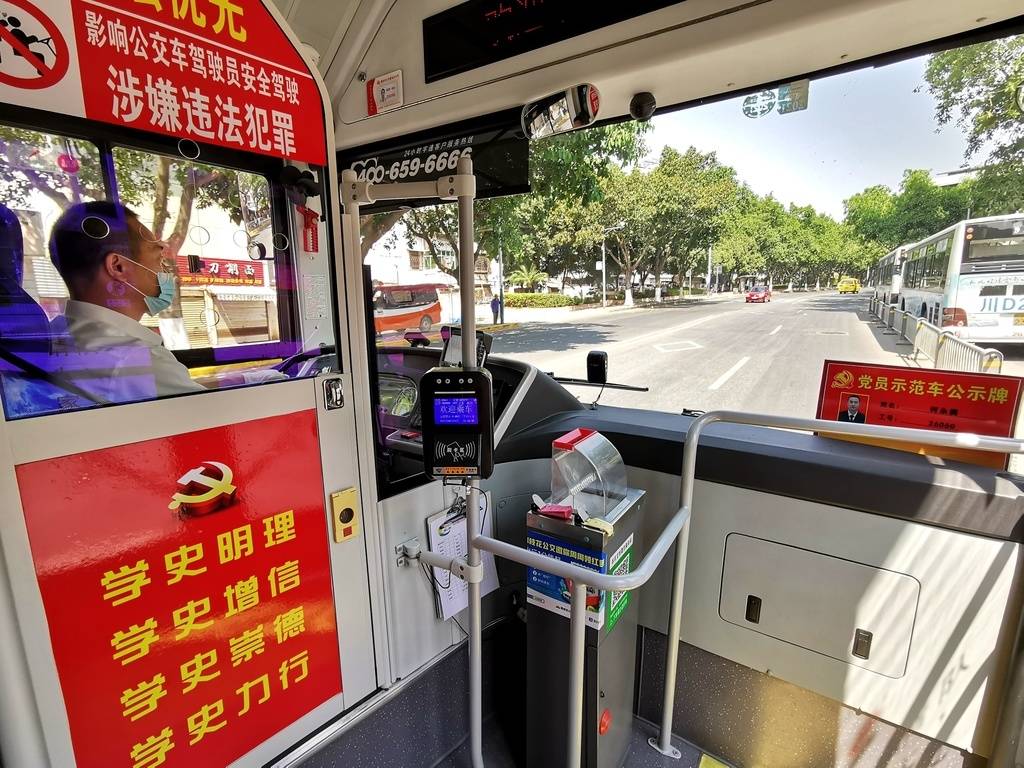 “乘客走进车厢,就能感受到浓厚的党史学习教育氛围。”驾驶这台红色主题车的,是党员示范车驾驶员何永勇。他所驾驶的63路公交线路,从攀枝花南站往返密地大桥南,行经攀枝花市主城区,跑一趟用时近70分钟,乘客在这台红色主题车上,既能看沿途的风景,感受城市的发展变化,也能从流动课堂上重温中国共产党波澜壮阔的辉煌历程。