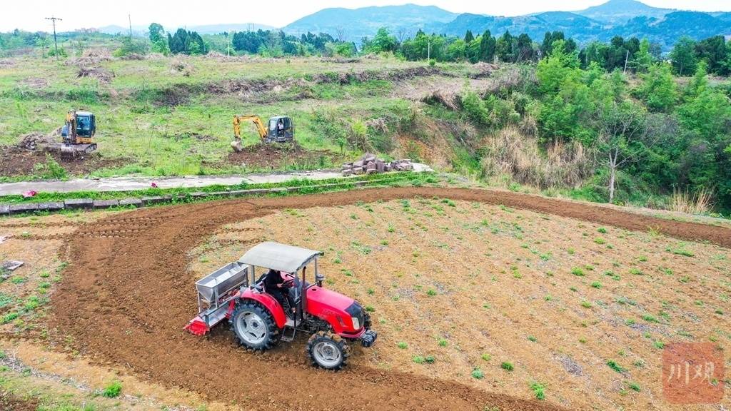 4月14日,遂宁射洪市金华镇西山坪村,几台大型机器正在撂荒地里不停地忙碌着。撂荒地翻整完成后,将用于种植蔬菜、水果。