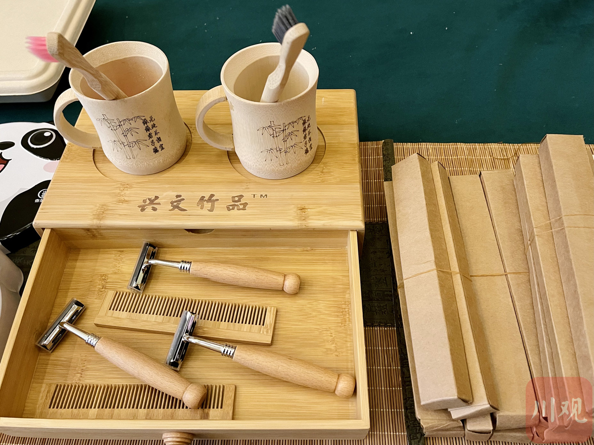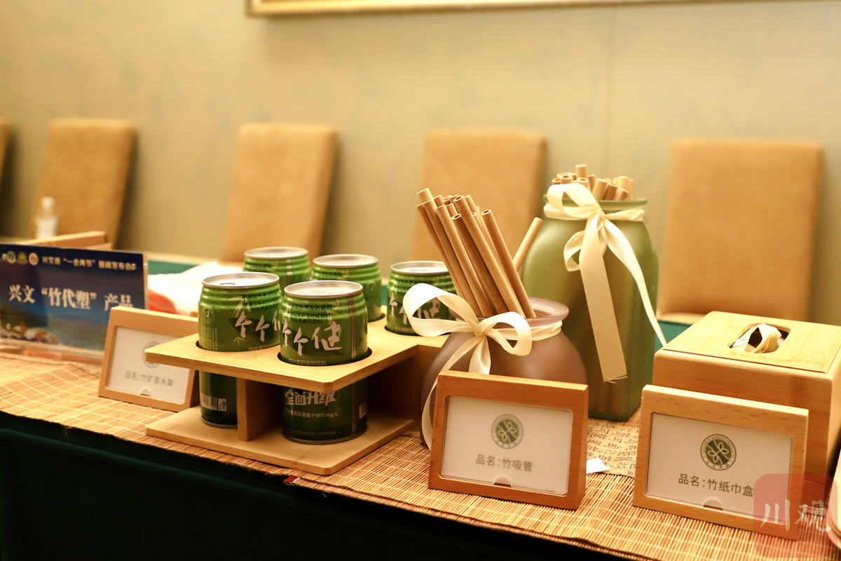 当天的发布会上,兴文县就展示了前期制造的部分竹制造日用品,包括可供奶茶店使用的吸管、精美的酒店洗漱套装、杯子,被餐厅广泛使用的打包饭盒、一次性餐盘,以竹纤维为主要成本的毛巾、食物、手机壳等,涉及生活的多个方面。