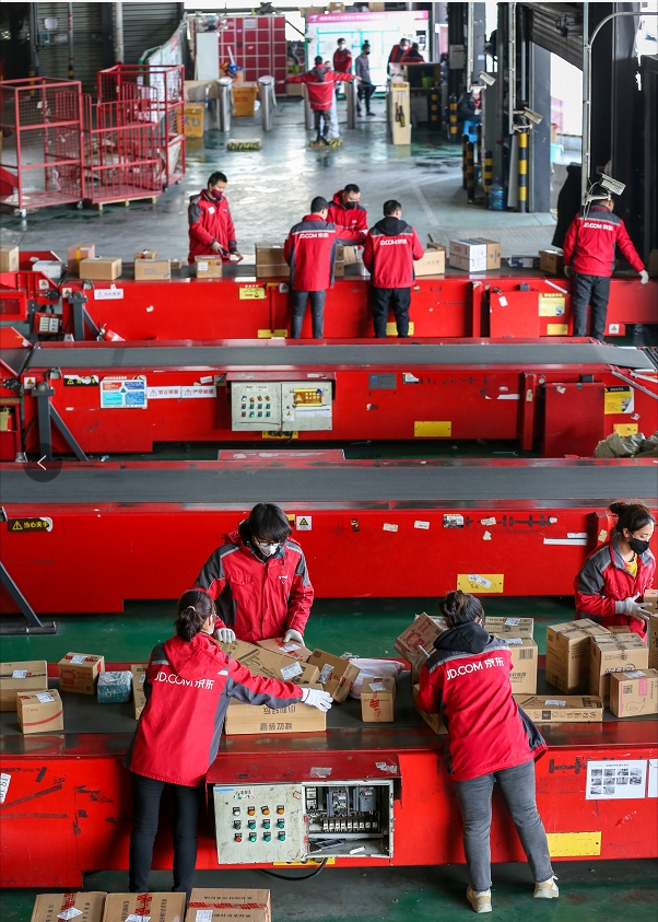 苏宁物流车间,工作人员正在仓库忙着分拣货物。白桂斌 摄