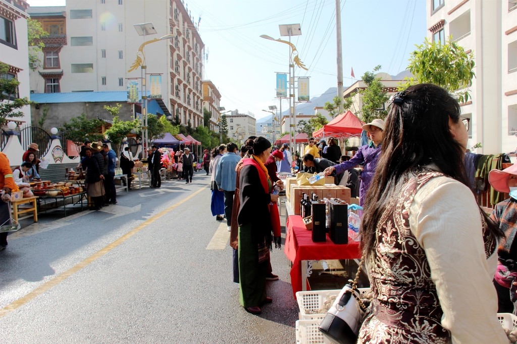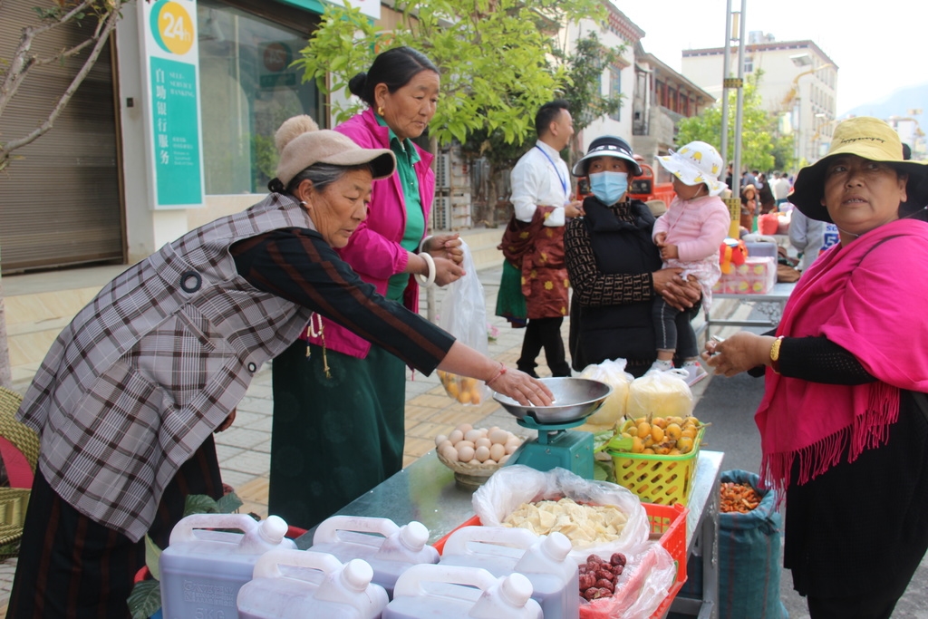 在情舞路“赶场日”现场,藏鸡藏猪、酥油、核桃、时令蔬菜、非遗传统车模、生活用品等一应俱全,前来采购的顾客络绎不绝。“给我买2只土鸡”“给我装点洋芋”“这个树椒酱怎么卖”……整个集市热火朝天。