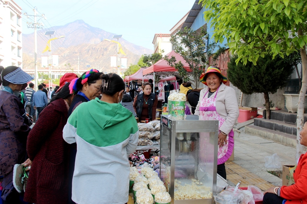 爆米花摊位老板次珠曲错忙得不可开交,“原来我就过年才卖爆米花,一天能卖300元,现在趁着赶场日两个小时我已经卖了近200元。不用交摊位费、人还多,这个活动很好很方便。”