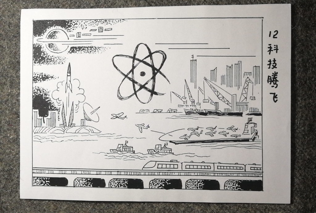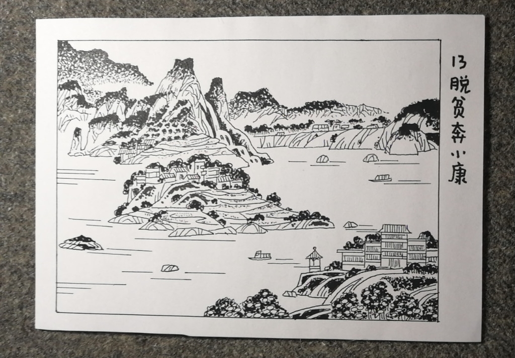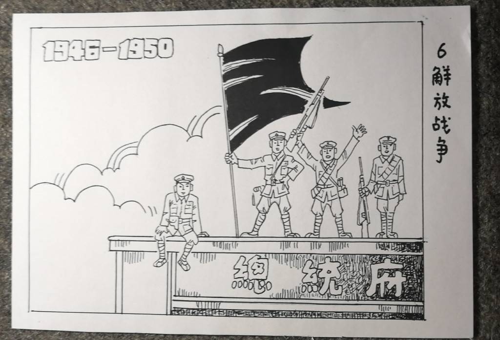 书桌上,整齐地摆放着一组连环画,这正是庞老为庆祝中国共产党成立100周年而创作的《光辉历程——庆祝中国共产党成立一百周年》连环画。作品由黑色钢笔绘制而成,总共15页,画面简洁、生动,人物刻画更是栩栩如生。