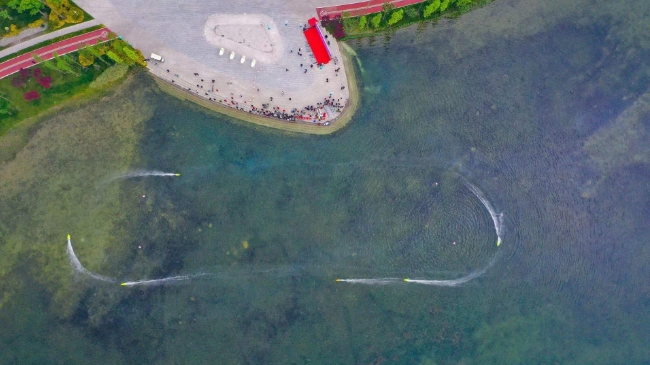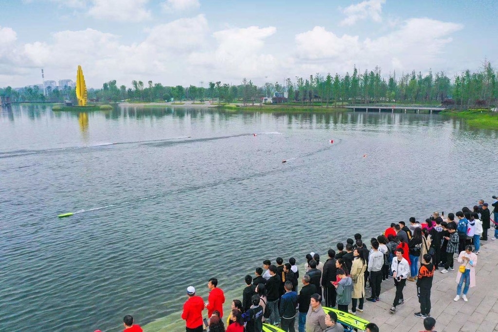 4月17日,成都市郫都区菁蓉湖平静的水面突然“不平静”了,川渝航模友谊赛在此举行。湖面上,数十艘“舰船”尽情驰骋,时而你追我赶水花四溅,时而编队航行“百轲争流”,时而激烈“交火”炮声隆隆,一幕幕精彩激烈的场面,令现场观众大饱眼福。