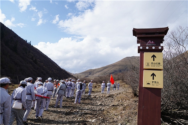 参观完革命遗址后,党员干部们来到梦笔山雪山红路,重走长征路。梦笔山是小金县与马尔康市的界山,海拔达4400米。1935年6月下旬,毛泽东等领导人率红一方面军由此进入马尔康地区,踏上了北上抗日的伟大征程。在梦笔山红路,党员干部们行进在崎岖的山路上,努力克服高原反应带来的种种不适,与寒风较量,与稀薄的空气斗争,体验红军长征的艰难历程。短短两三公里的雪山红路,海拔近4000米,党员们整整行进了一个小时。随着海拔的攀升,胸闷、头晕、心跳加快的情况接踵而至,才走一小段就累得气喘吁吁。