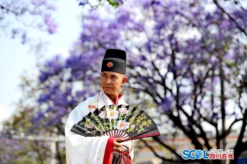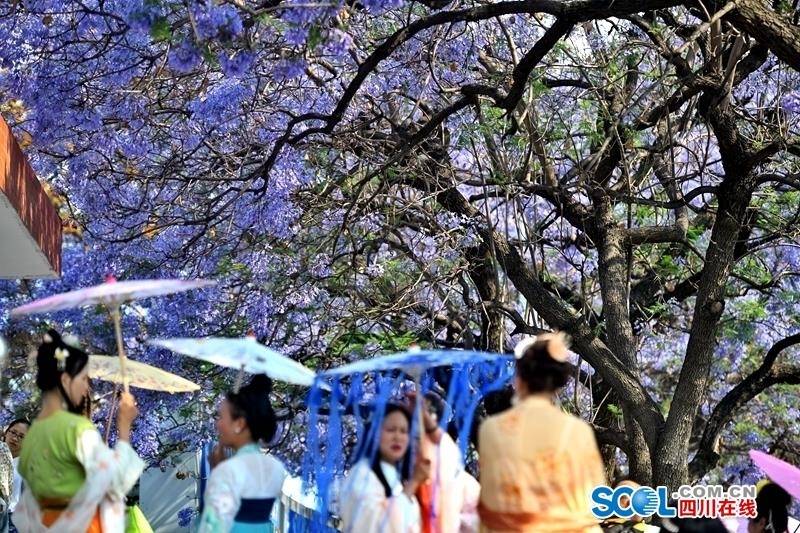 4月18日午后,四川凉山彝族自治州西昌市的航天北路到五一桥一带,仿佛穿越到古代,当地的汉服爱好者聚集于此,这别样的风景,给本是网红打卡地的蓝花楹一条街再增添了一抹生动。