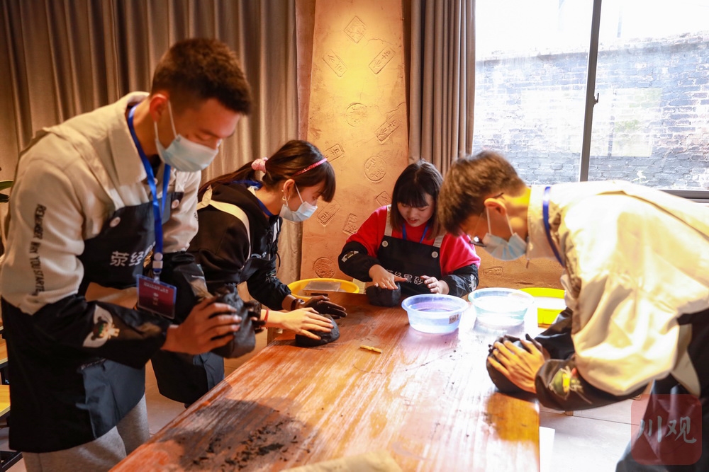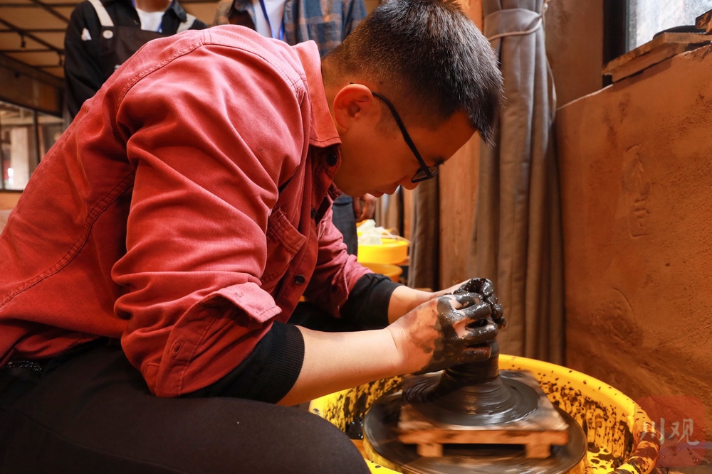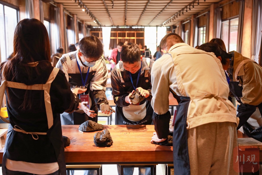 参观完黑砂出炉,选手们紧接着开始练习制胚。来自雅安市职业技术学院的陈怡帆,刚接触黑砂制作不久,对砂器制作跃跃欲试。结合这次创作营的主题,他除了想做一些实用的锅碗器具,还想尝试制作手机保护壳等具有创造性的作品。“我很珍惜这次的学习机会”,陈怡帆说,“希望通过这次创作营,能更好地领悟匠人精神,以后将黑砂技艺发扬光大。”