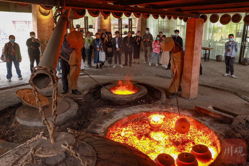 在开幕式后,四川省非物质文化遗产传承人曾庆红为选手们展示了黑砂出炉的过程。随着窑炉打开,熊熊的火苗蹿出地坑,烧得红彤彤得砂罐整齐排列。只见曾庆红熟练地用长杆将砂罐挑入还原坑,加入松木锯末并快速密闭坑口。