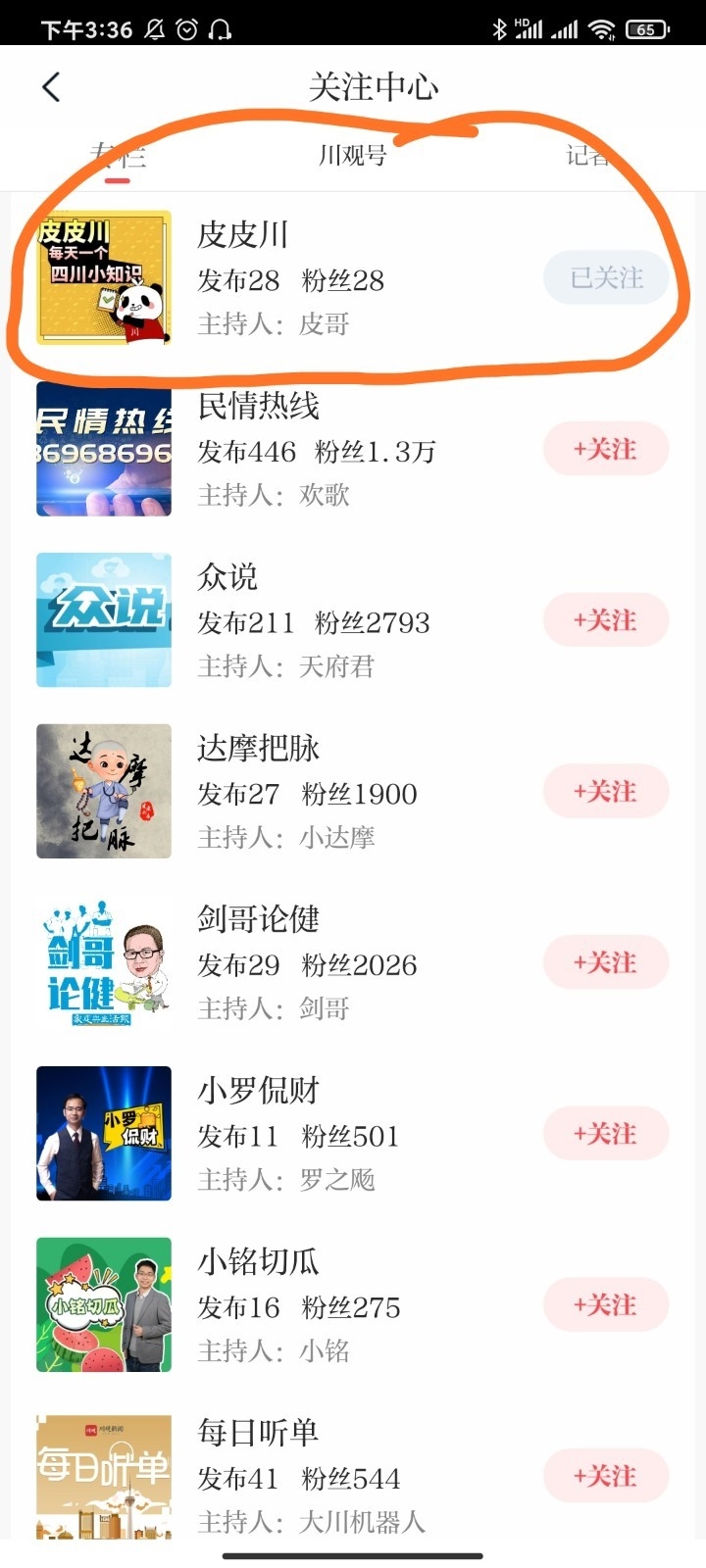 ②在专栏列表里,找到“皮皮川”,点击右侧的“关注”即可