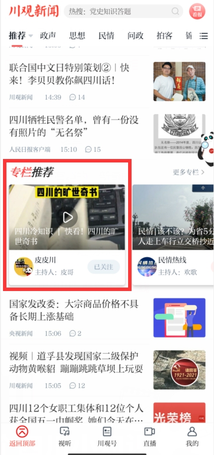 ①在川观新闻首页,向下拉到“专栏推荐”,点击进入