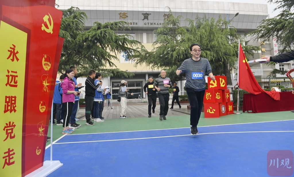 四川日报·四川在线记者在现场看到,跑道四周和教学楼前,党旗飘扬,助威声、呐喊声此起彼伏,催人奋进。冲到终点的老党员王昆老师激动的告诉记者,“这次环校跑活动既是一场对健康的奔赴,更是一场穿越百年依旧坚守的约会。我一定会坚守共产党人的初心使命,以实干勇挑时代担当。”