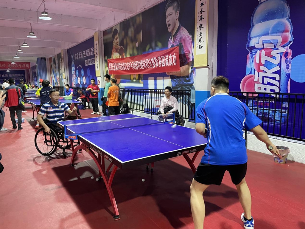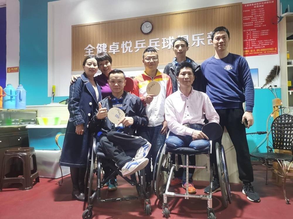 坐在轮椅上的杨茂良、彭忠是来自渝中君乐乒乓球俱乐部的残疾乒乓球学员,他们身后的是重庆市涪陵区残疾人康复服务中心乐一融合特教中心的魏吉。
