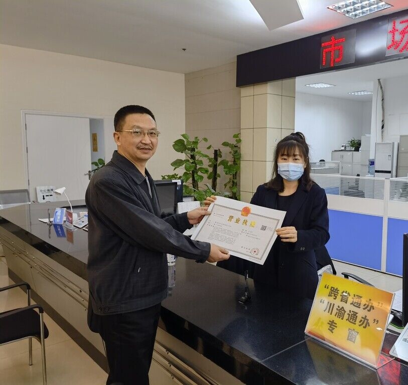 当天,张军在自贡市政务服务和数字化管理局政务大厅市场监管局“川渝通办”专窗,顺利领到带有江北区市场监督管理局电子印章的营业执照,这是自贡发出的首张“川渝通办”营业执照,标志着自贡进一步抓深抓实营商环境优化,为全面融入成渝地区双城经济圈建设增加新动能。