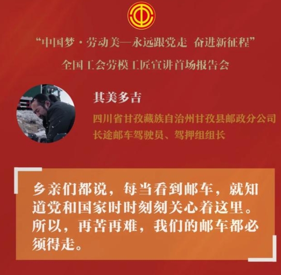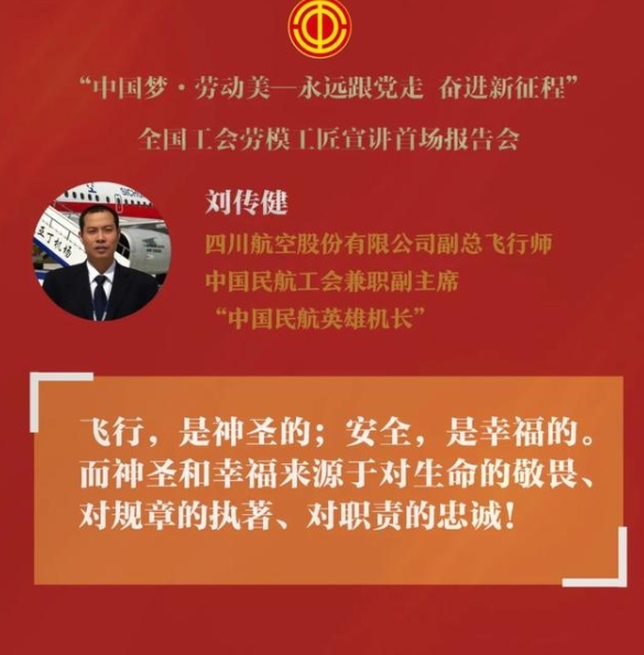 4月19日记者从省总工会获悉,中华全国总工会日前在北京举办“中国梦·劳动美——永远跟党走 奋进新征程”全国工会劳模工匠宣讲活动首场报告会暨全国巡回宣讲启动仪式。首场报告会上,中国民航英雄机长、全国五一劳动奖章获得者、四川航空股份有限公司副总飞行师刘传健,全国劳动模范、雪线信使、中国邮政甘孜县分公司邮运驾驶组组长其美多吉相继亮相,他们讲述的励志故事和传奇经历,赢得了阵阵热烈掌声。