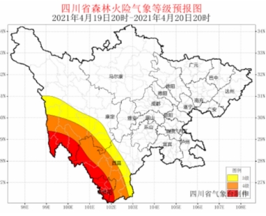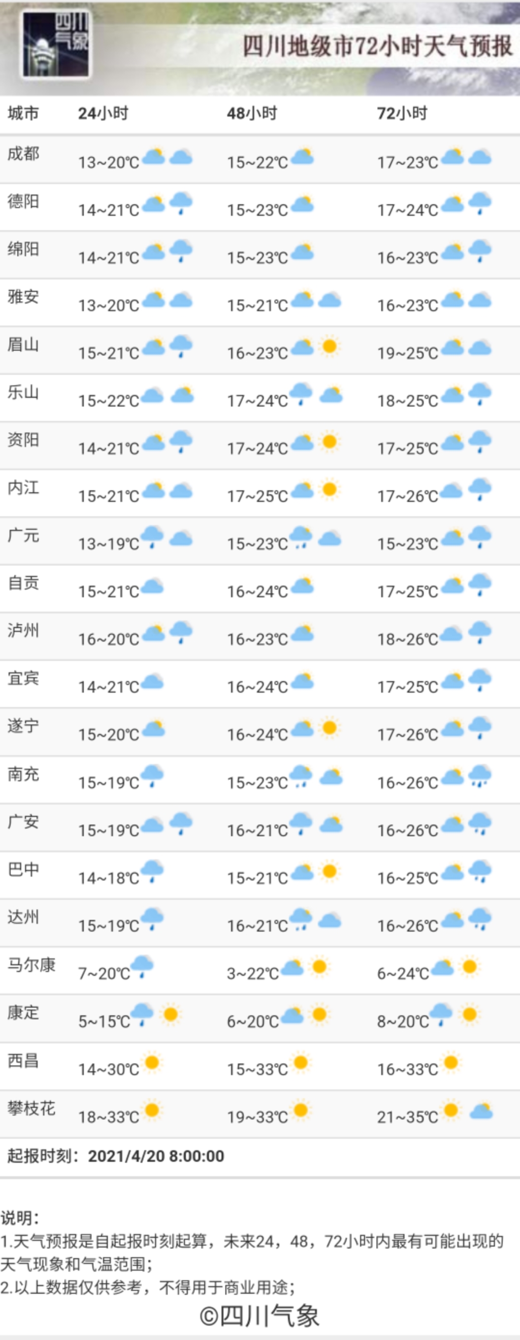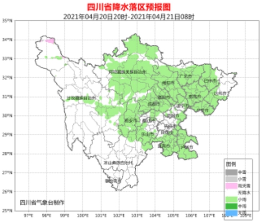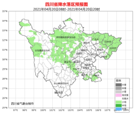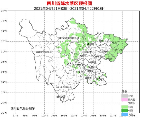 4月21日白天到晚上,巴中、达州、广安、广元4市及盆地西部沿山小雨转多云,盆地其余地方多云间晴;川西高原和攀西地区晴间多云。