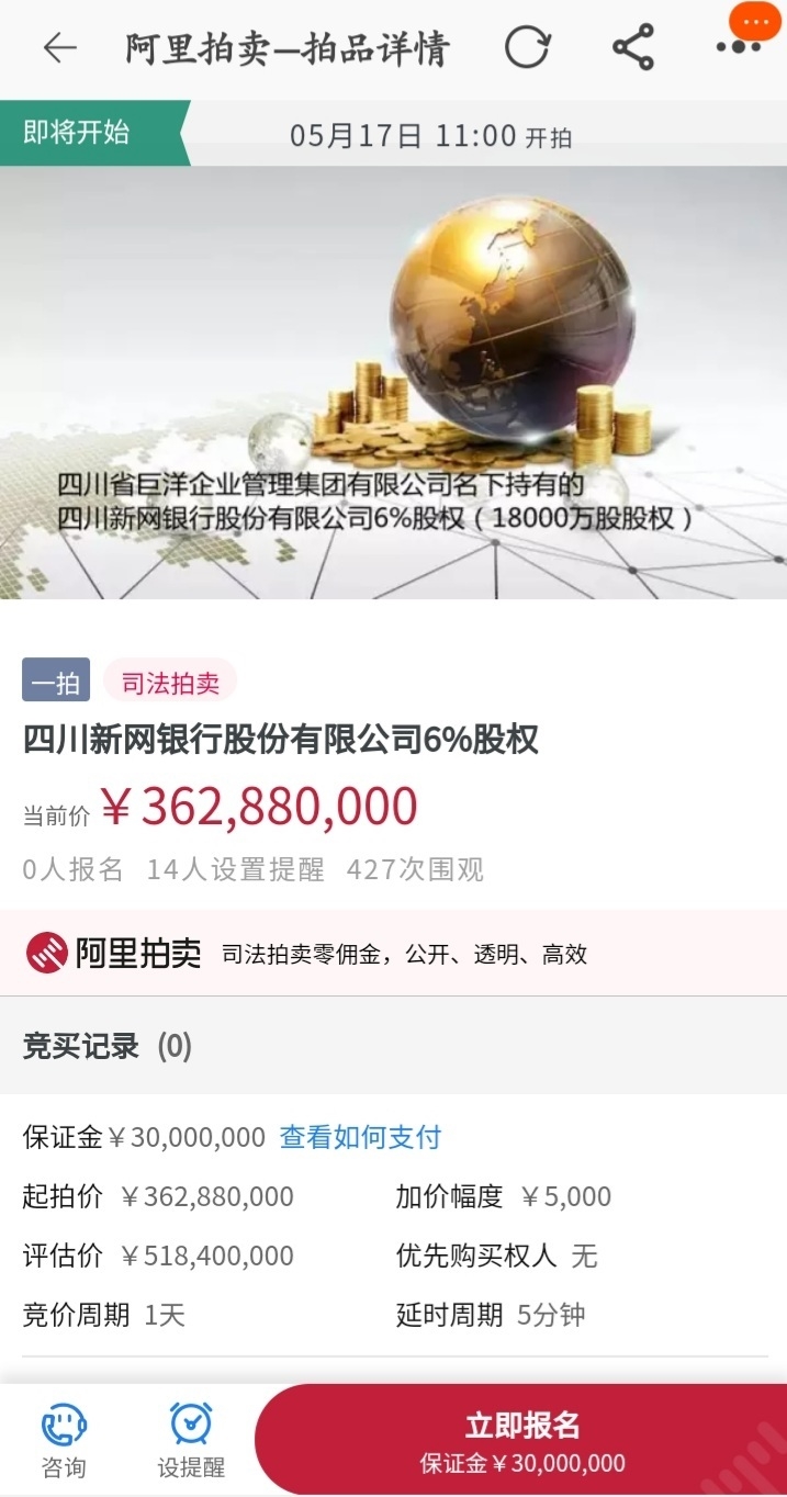公开信息显示,5月17日11时至5月18日11时,新疆乌鲁木齐市铁路运输中级法院将在“淘宝网”,对四川省巨洋企业管理集团有限公司(四川巨洋集团)持有的四川新网银行股份有限公司6%股权(18000万股)进行网络司法拍卖活动,起拍价3.6288亿元,折合每股起拍价为2.016元,评估价为5.184亿元。