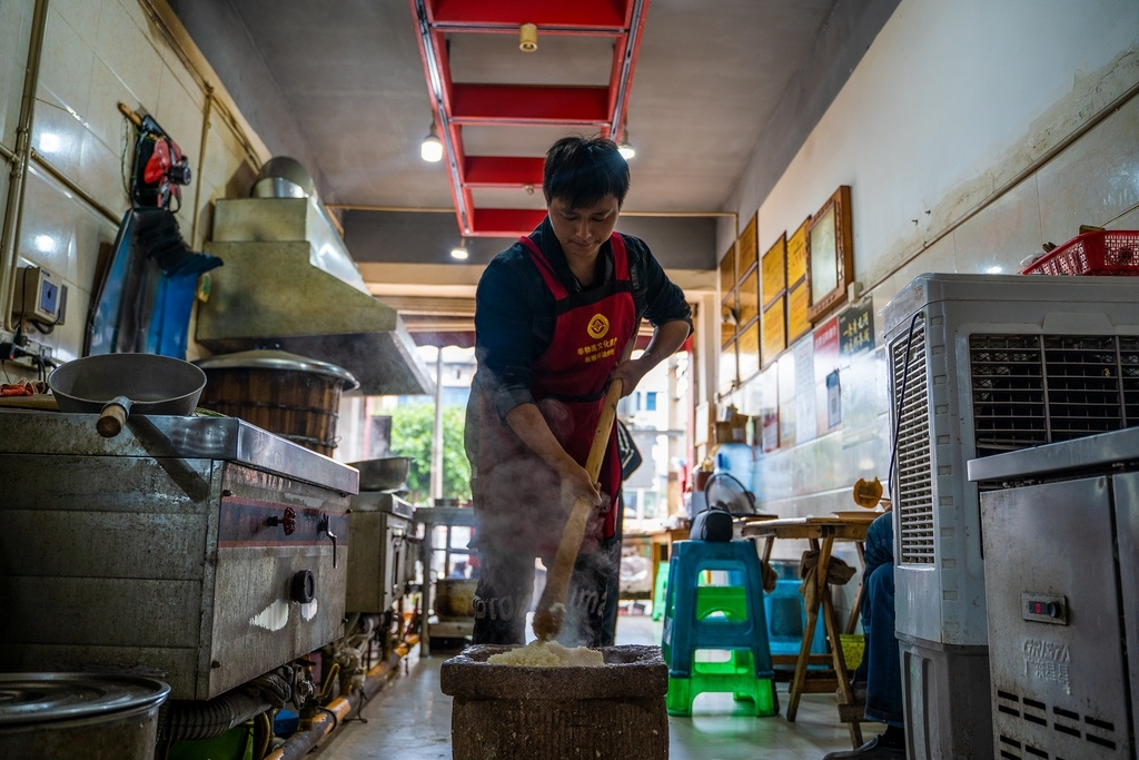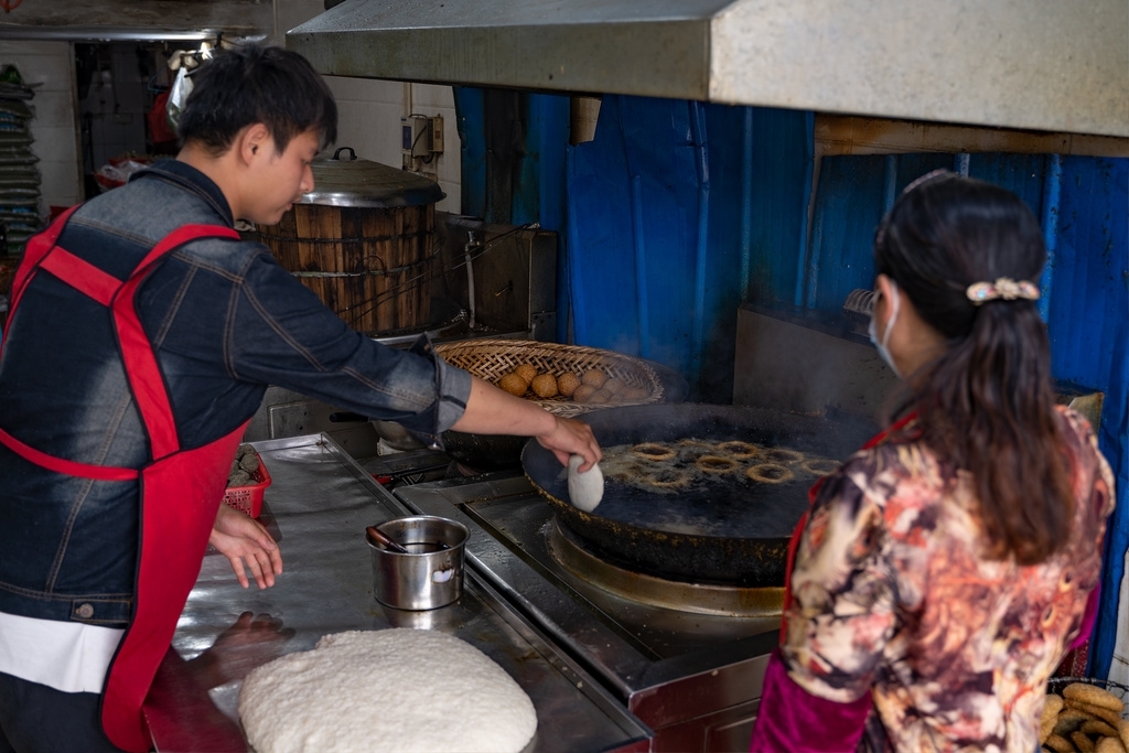 从顾客下单到拿到一个热气腾腾的油炸粑,最快可能只要几十秒。“很多人都说看我做油炸粑不费力,其实是没有了解里面制作的繁杂。”门源表示,看起来轻松的制作过程,他花了三年才学成,又在店里帮工了三年才正式接管了这家油炸粑店铺。