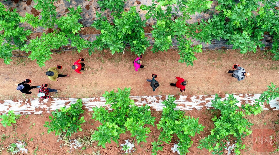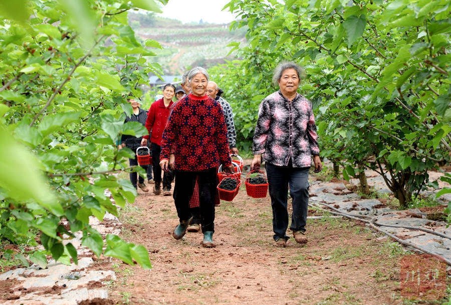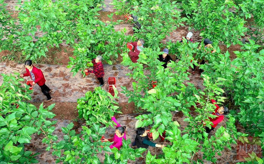 仁寿县钟祥镇中华村九店垭家庭农场的桑园里,村民们正在运送刚采摘的桑葚。