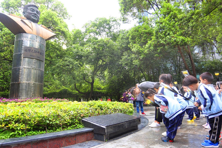 4月20日上午,在绵阳市人民公园邓稼先纪念广场上,来自我市川幼春晖幼儿园开展“缅怀革命先烈 传承红色基因”主题活动,数十名小中混龄幼儿及家长们向在两弹元勋邓稼先纪念碑前,献上鲜花,缅怀为“两弹一星”做出卓越贡献的研究者和工作者,大力弘扬以爱国主义为核心的民族精神,和中华民族优秀传统文化,希望通过活动缅怀革命先烈,充分利用教育铸魂的育人功能,认清自己的“根”,凝聚自己的 “魂”,向孩子们厚植爱国情怀,让“两弹一星”精神永放光芒。