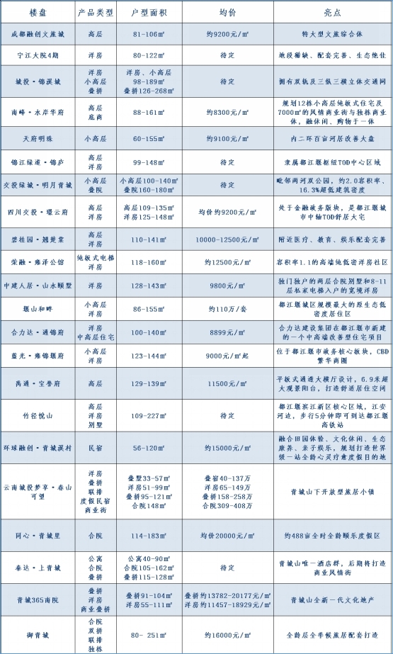 今年还值得关注的主城楼盘里,紧邻走马河绿道、成灌高铁的城投·锦溪城拥有洋房、小高层和叠拼;都江堰枢纽TOD中心区域的锦江绿道·锦庐无论是商业、医疗、教育或是生态环境都富足;内二环的百亩河居改善大盘天府明珠提供60-155平方米的户型……