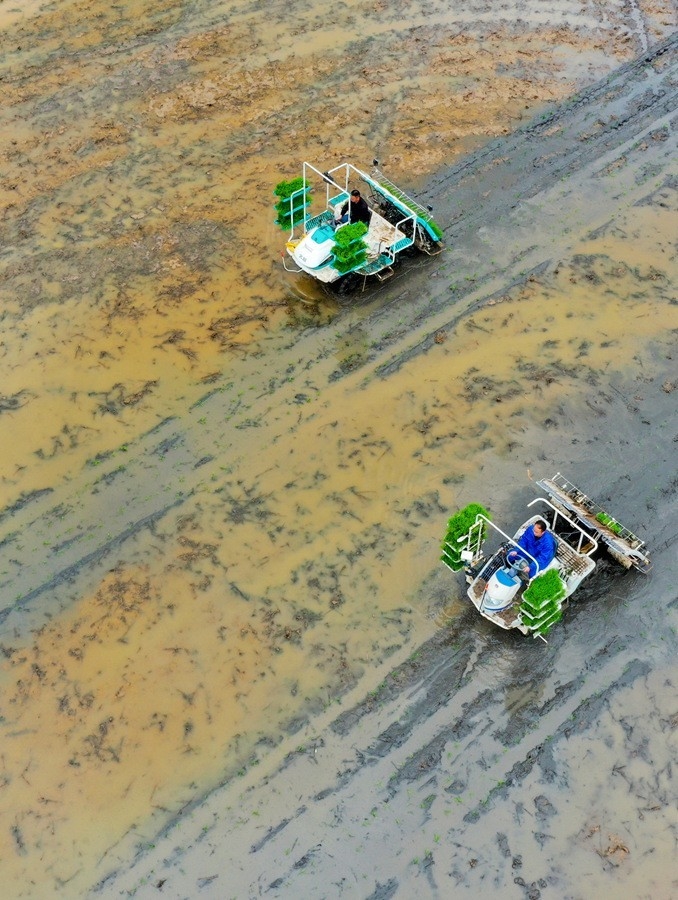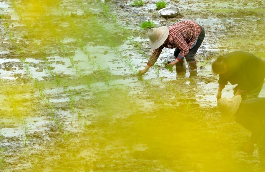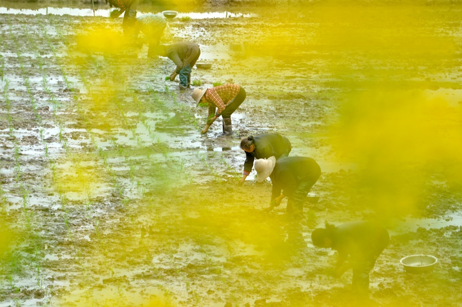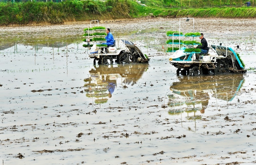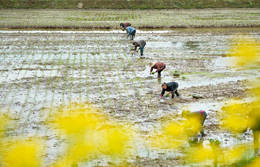 2021年4月21日,广安市岳池县苟角镇红朝门村村民在抢抓农时,奔忙在田间地头,抓紧栽秧种植水稻。