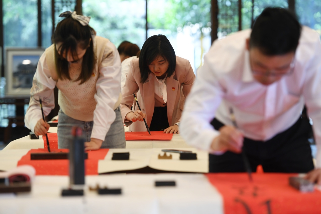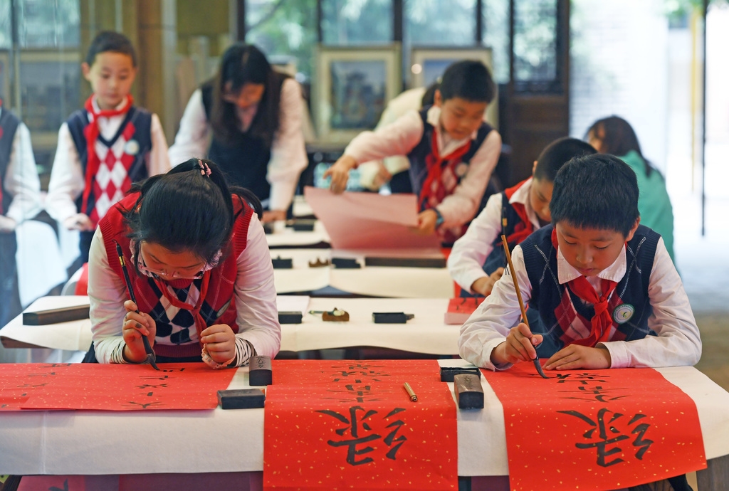 4月21日,成都市龙江路小学武侯新城分校举行献礼建党100周年红色主题系列活动之一的“翰墨飘香学党史”书法活动。