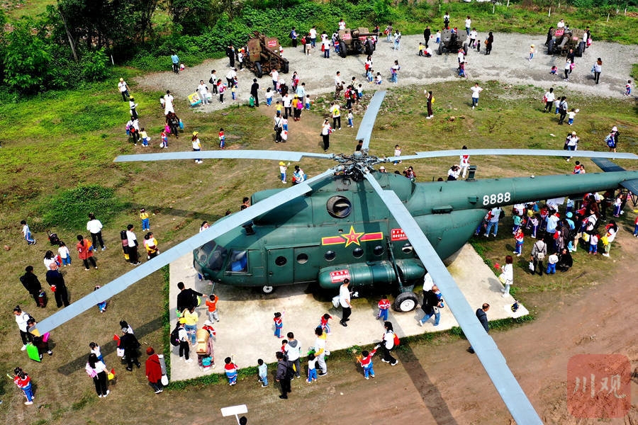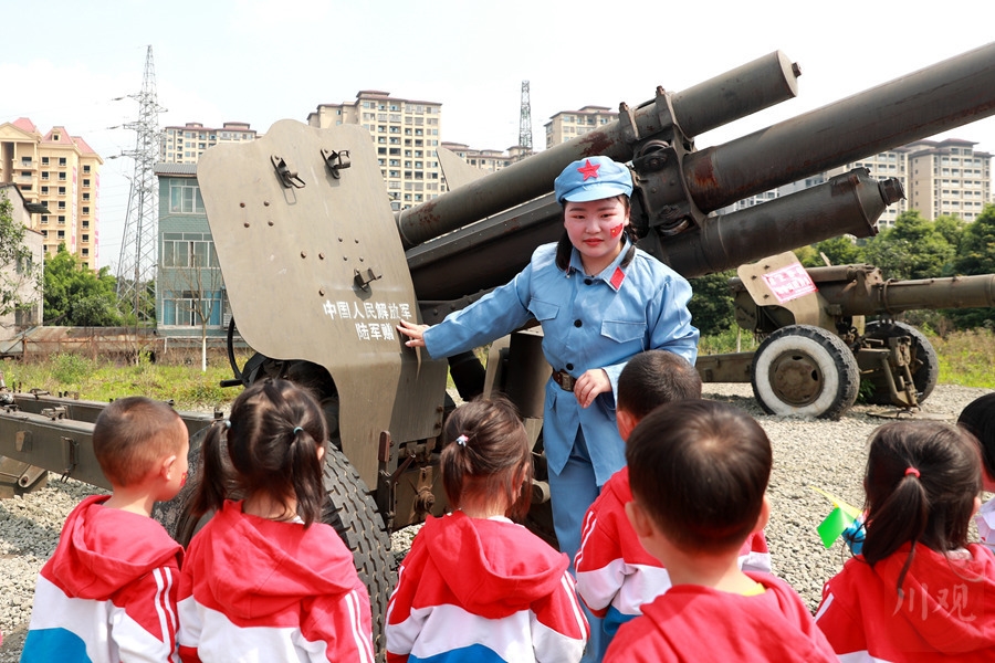 泸州市纳溪区幼儿园的小朋友参观国防教育基地设备。
