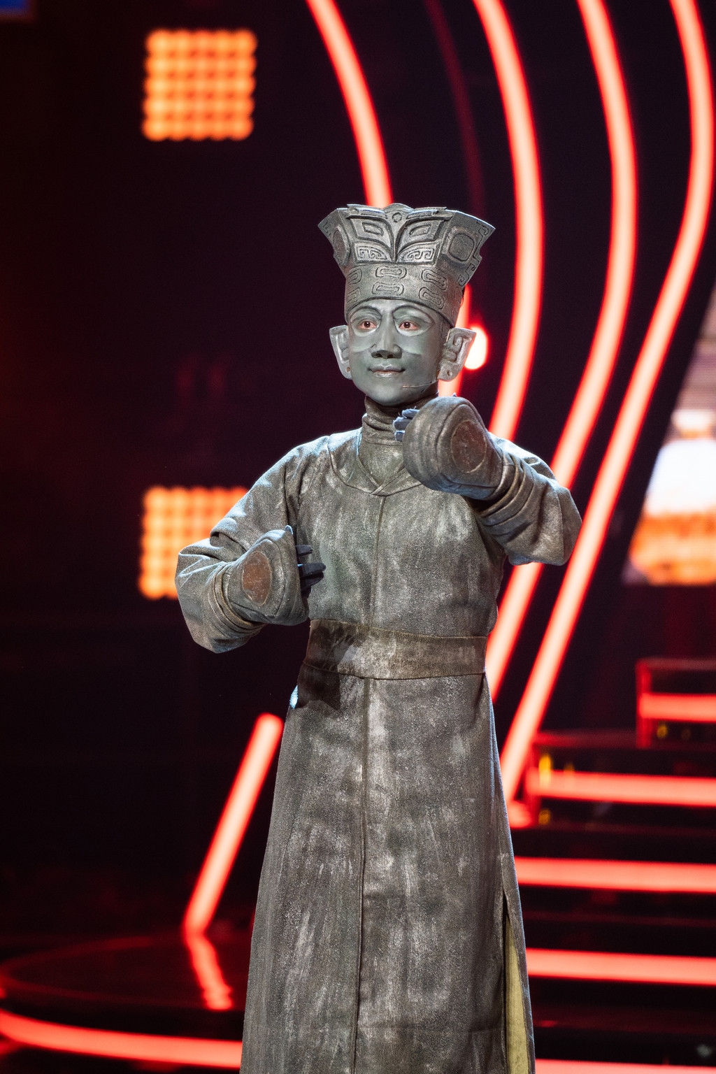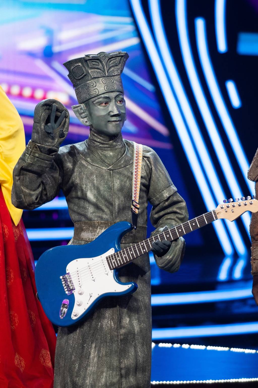 三星堆青铜大立人非常神秘的一点就是其手里究竟握的是什么东西,一直以来引发了诸多猜想,节目中也将其作为一个亮点进行创作,让“大立人”手握电吉他,与不倒翁小姐姐、秦始皇陵兵马俑共同组合成团出道。