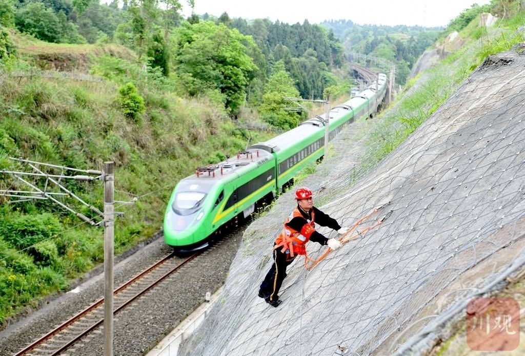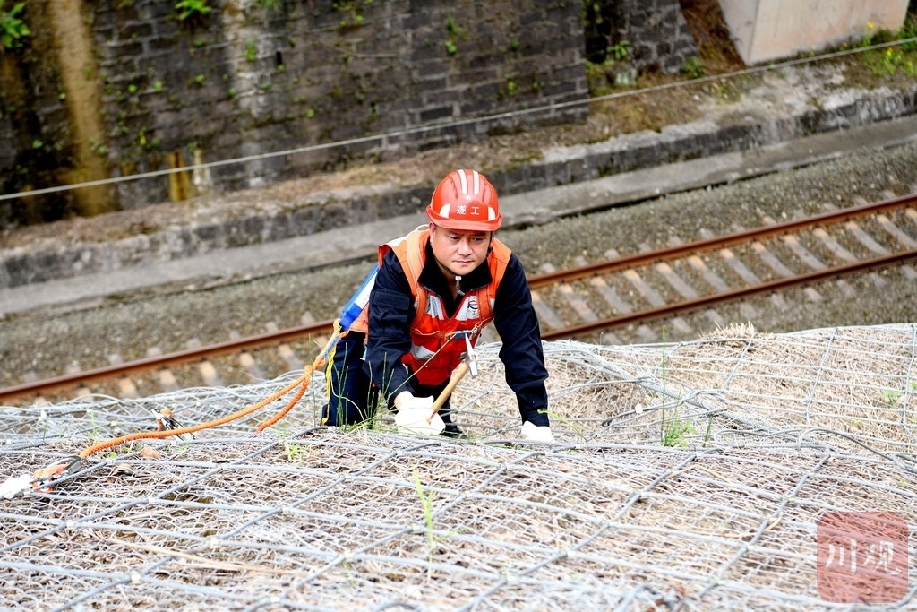 4月21日,潼南桥路检查工区工长黄勇正在对主动防护网进行重点检查。