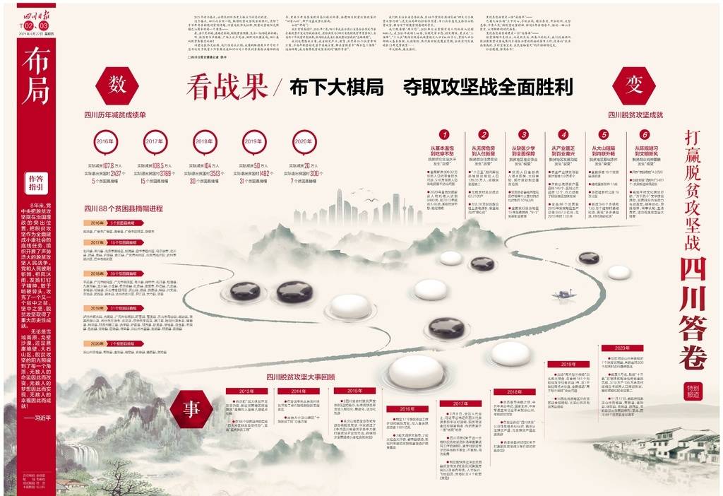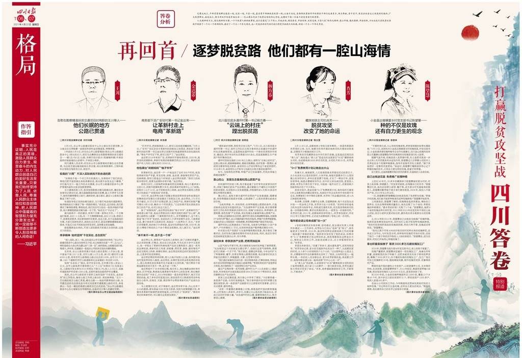 它以“四川答卷”起头,后面7个联版分别用了7个“局”字作为关键词——布局、战局、格局、大局、破局、解局、新局,全景呈现四川打赢脱贫攻坚战的历程,记录下四川历史上这无比豪迈的胜利。
