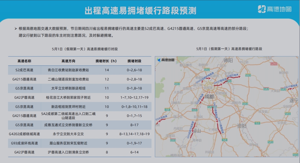 从具体时段看,预计2021年4月30日(五一假期前一天)14时开始,全国高速交通压力逐渐增大,18时至21时拥堵程度较高。受高速免费通行影响, 预计5月1日9时至13时为高速出程拥堵高峰,特别是10时至11时将达峰值,5月5日15时至18时将迎高速返程拥堵高峰,预计16时至17时为返程拥堵峰值。