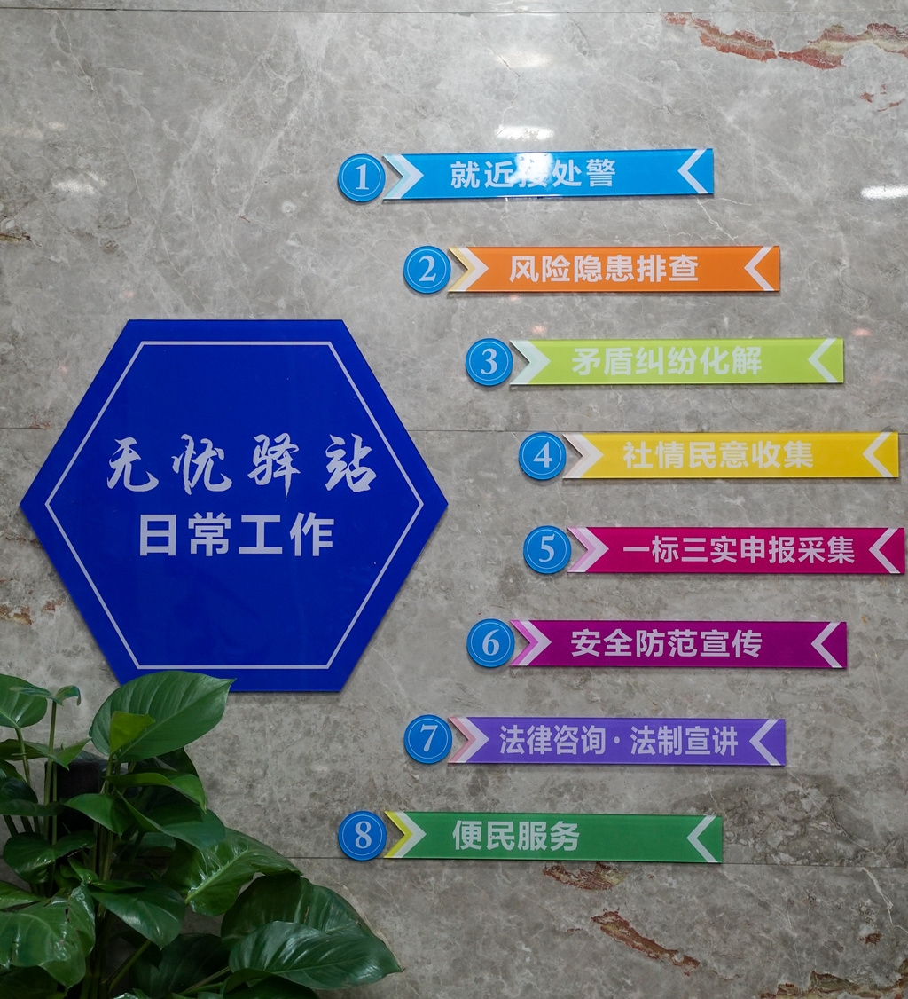 在现场,记者看到无忧驿站具备就近接处警、风险隐患排查、矛盾纠纷化解、社区民意收集、一标三实申报采集、安全防范宣传、法律咨询、法制宣讲、便民服务等几大核心功能,真正做到了让群众少跑路、节约警力与时间、净化企业营商环境。实现了“资源联享、问题联治、纠纷联调”,有效提升了矛盾纠纷调解成功率。
