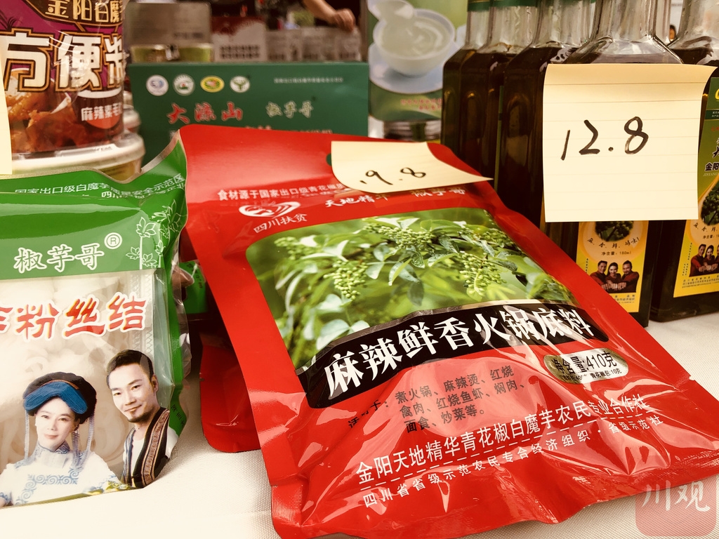 在展位上,各种口味的金阳白魔芋整齐地铺排着,旁边还放着一罐罐金阳青花椒、青花椒火锅底料、白魔芋方便米饭等各类加工后的农产品。这些产品都来自工行四川省分行定点帮扶县金阳天地精华青花椒白魔芋农民专业合作社。