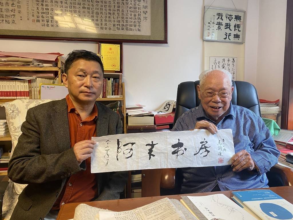 而今,“阿来书房”发布一周年。尽管书房在建,但雅集先行。此次在杜甫草堂的活动,正是阿来以书房之名,与读者的首次相约。值得一提的是,向往到“阿来书房”作客的,除了阿来的读者,还有他在文艺界的名家朋友,107岁百岁巨匠马识途正是其中一位。听闻“阿来书房”的诞生,马老激动不已。今年3月,马老专门提笔,展纸挥毫,为“阿来书房”题字。他告诉阿来:“我早就给你写好了,一直盼着你来拿,我也想去看看你那个书房。”阿来当即发出邀请:“那书房开业,马老你一定去坐坐,我们喝喝茶,聊聊天。”而这幅墨宝,在本次活动上正式揭幕,马老的书法端庄郑重,正与阿来所期望的书房要“雅正”相得益彰。