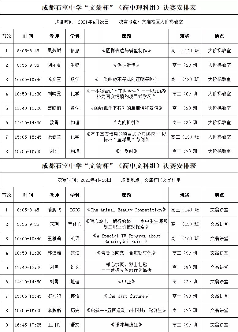遗憾的是这次大赛没有线上直播,市民需带上自己的身份证,出示健康码在校园入口实名登记。语文、数学、政治、体育,你会pick哪节课呢?还不快带上小板凳来石室中学蹭课,来晚了就没位置了哟!