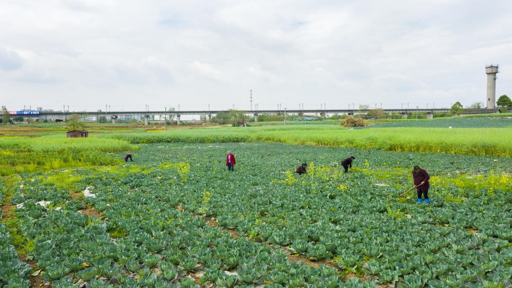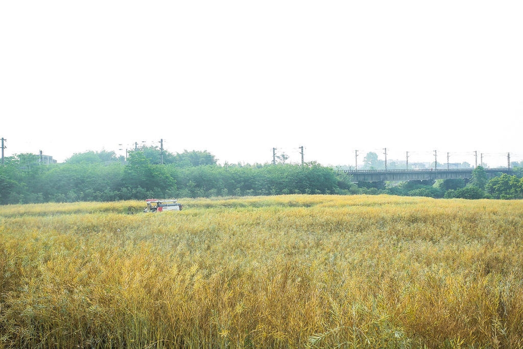 4月23日上午,锦城公园青龙湖湿地,工人们就在田间忙着收割莲花白、油菜籽。这是锦城公园收获的第一批农作物。