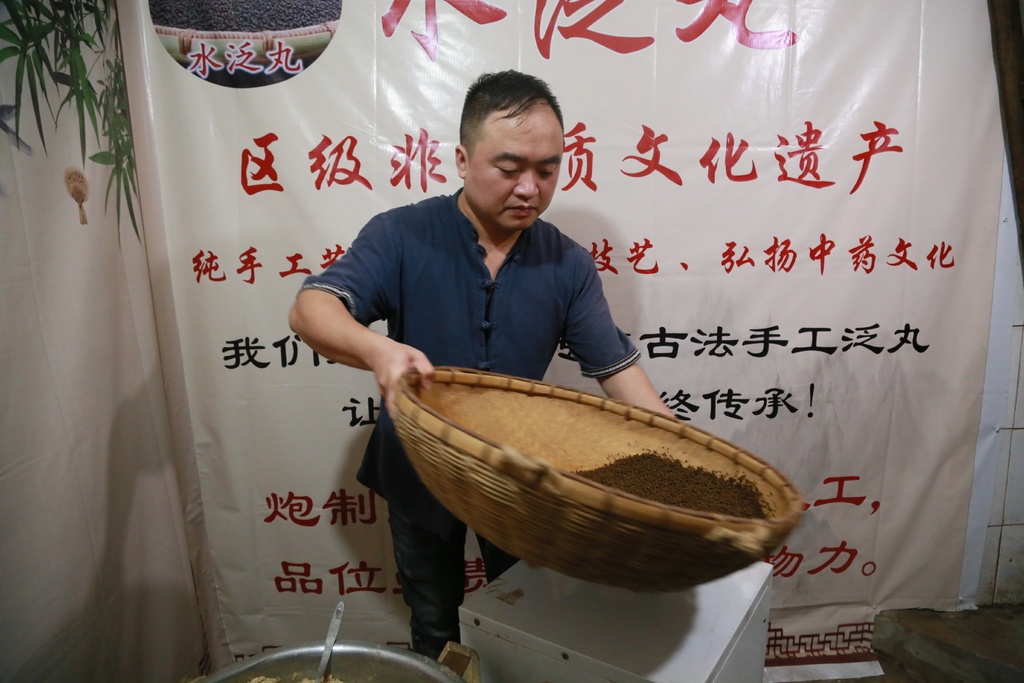 4月23日上午,内江市市中区城西街道公园街社区叠象街,一家不起眼的中药材加工作坊中,浓郁的药草香味扑面而来。市中区非物质文化遗产名录项目“水泛丸”传承人张建军正在将顾客送来的药材制作成水泛丸,加工作坊里坐满了客人,其中大多数都是老年人。“她们大部分都是拿着药材到我这里来,然后我们纯手工将这些药材加工成水泛丸。”作坊的老板张建军说。