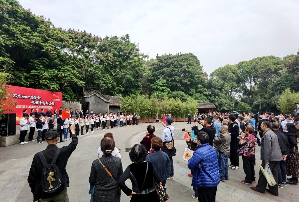 为庆祝中国共产党成立100周年,4月23日,由成都市公园城市建设管理局指导,成都市人民公园、电子科技大学信息与通信党委联合举办以“不忘初心担使命,砥砺奋进新征程”为主题的红色经典诗歌朗诵会在人民公园保路纪念广场举行。公园职工、电子科大信通工程学院师生代表以及自发参与的市民、游客100余人用蓬勃的朝气共同迎接第26个世界读书日的到来,为庆祝建党100周年献礼。