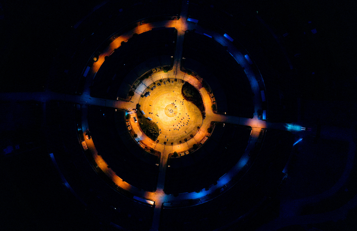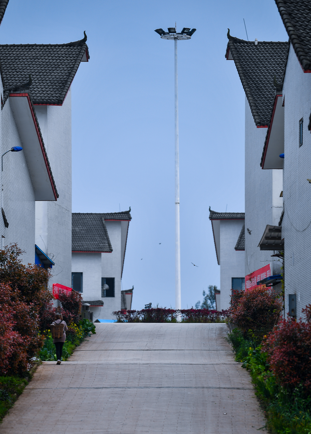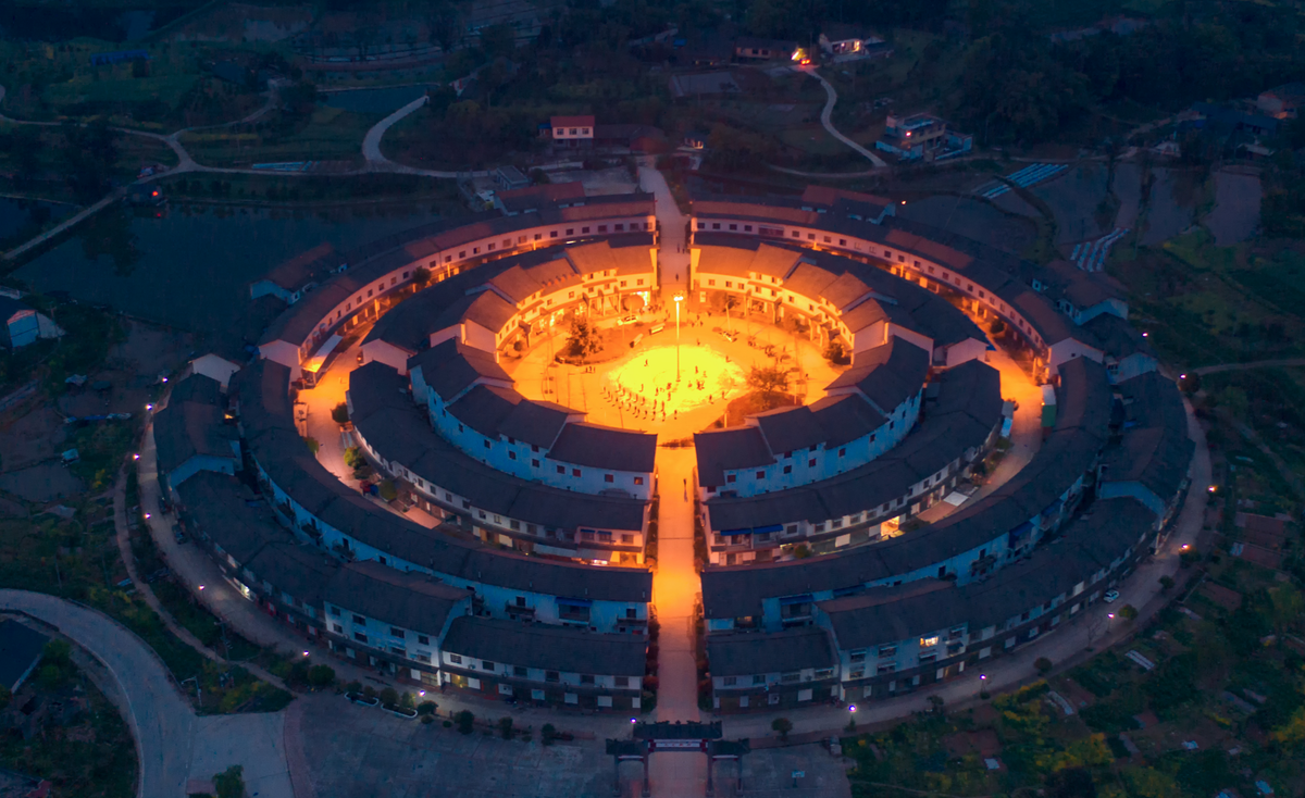 4月,太阳西沉,夜色渐起。自贡市留佳镇龙凤新村,路灯从里到外依次打开,从空中俯瞰,整个采用福建客家围楼风格建造的新村格外漂亮。