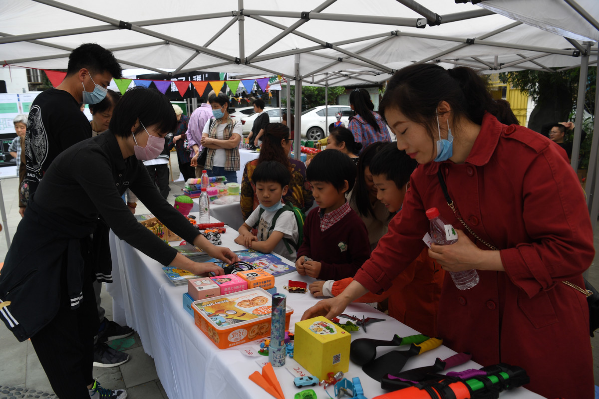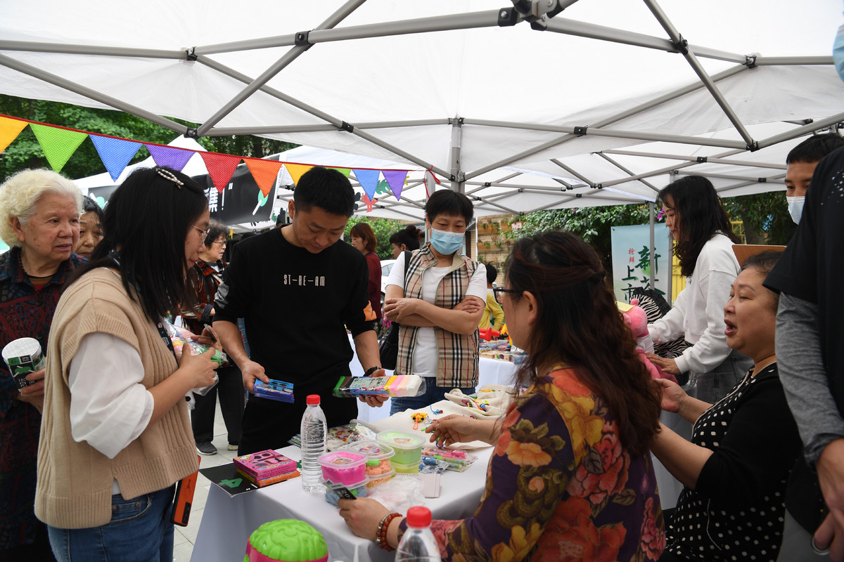 本次活动不仅设置了“玉商论坛”,邀请玉林东路社区的三家店铺老板,向居民分享店铺经营的趣事,还特别打造了“撒子!市集”,让居民自由进行旧物交换。